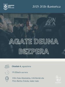 Beste urte batez Otsailaren 4ean, eguaztenean, 19.00tatik aurrera Kilin Kala Abesbatzeko kideak izango dituzue Agate Deuna kalerik kale abesten POTO BERTSO ESKOLAko bertsolariekin batera