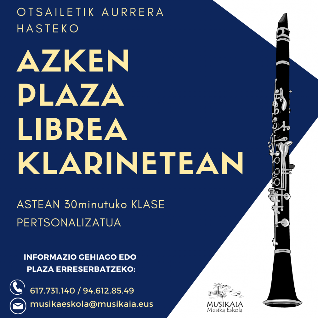 2022-01-27 KLARINETE ikasgaian azken plaza librea eskeintzen dugu. Otsailetik aurrera hasteko aukera; bakarkako klase pertsonalizatuak, profesional baten gidaritzapean!