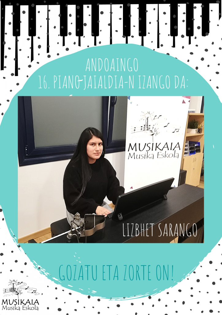 2021-02-25 Datorren asteburu honetan Andoaingo 16. Piano Jaialdia ospatuko da. Bertan Euskal Herriko Musika Eskola ezberdinetako hainbat pianoko ikaslek parte hartuko dute. Lekeitiotik, LIZBHET SARANGO izango dugu partaide. Zorte on eta gozatu!!!