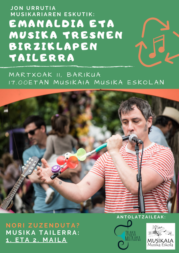 2022-03-10 Bariku honetan Jon Urrutia musikariak (Trakamatraka) kontzertu bat eskainiko die gure Musika Tailerreko ikasleei eta ondoren, musika tresnen birziklapen tailerrarekin jarraituko dute.