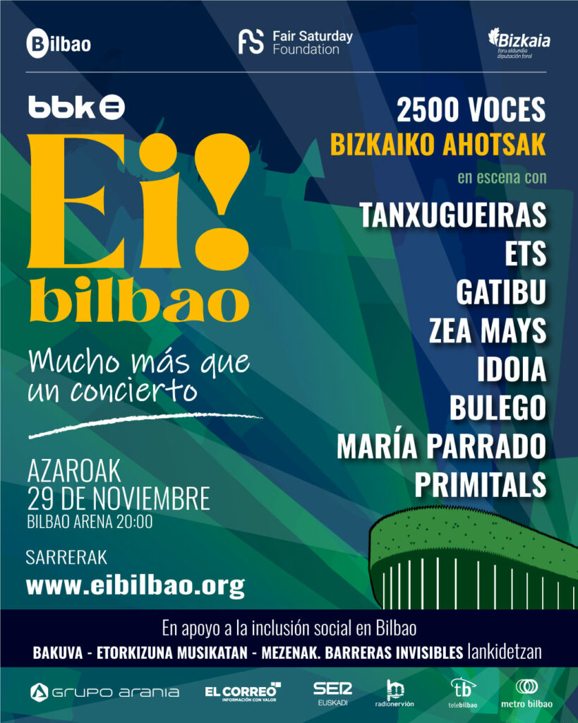 Musikaia Musika Eskola – Lekeitio:Fair Saturday fundazioak antolatuta “Ei Bilbao” ikuskizuna ospatuko da, azaroak 29an Bilbao Arenan. ETS, GATIBU, ZEA MAYS, BULEGO, IDOIA … moduko artista handiak, orkestra eta koruekin fusionatuta. Eta koruen artean, aurten lehen aldiz, Musikaiako KORAL GAZTE taldeak parte hartuko du. Pozez eta ilusioz hasi dira abestiak prestatzen! Eskuratu sarrerak eta ez […]