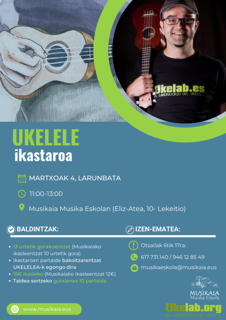 🔊 Hona hemen martxoak 4an 11.00etatik 13.00etara eskeiniko dugun hurrengo tailerra… UKELELE IKASTAROA! (https://www.ukelab.org/) 🗒🖊Interesa baduzu OTSAILAK 6tik 17ra zure izena eman dezakezu gure emailera idatziz (musikaeskola@musikaia.eus) edo musika eskolara deituz (617 731 140 edo 946 12 85 49). 🎶Musikaiako ikasleak ez direnak 13 urtetik gora apuntatu daitezke 15€ren truke, aldiz, musika eskolako ikasleak 10 […]