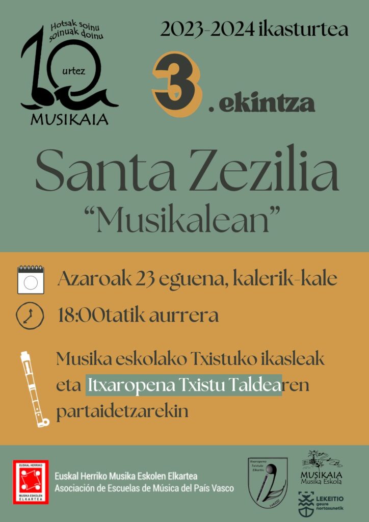 Para seguir celebrando nuestro 10. aniversario, celebraremos el día de Santa Cecilia «Musikalean», como 3. actividad. En esta actividad participarán l@s alumn@s de txistu de Musikaia y con ell@s colaborarán el grupo de Txistularis de Itxaropena. 🗓23 de noviembre de calle en calle🕖a partir de las 18.00 “Hotsak soinu, soinuak doinu. 10 urtez, Musikaia”