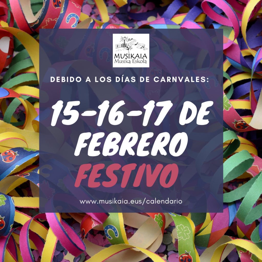 08-02-2021 Debido a que la semana que viene son días de carnaval en el calendario, los días 15-16-17 de febrero serán festivos en Musikaia Musika Eskola.