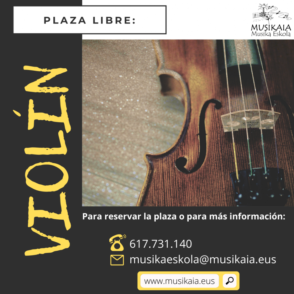 14-01-2021 Por motivos de maternidad, ha quedado libre una plaza en VIOLÍN . Esta plaza estará disponible a partir de febrero. Si quierés más información sobre esta oferta o quieras reservar la plaza, puedes llamar o escribir a secretaría: 617.731.140 musikaeskola@musikaia.eus