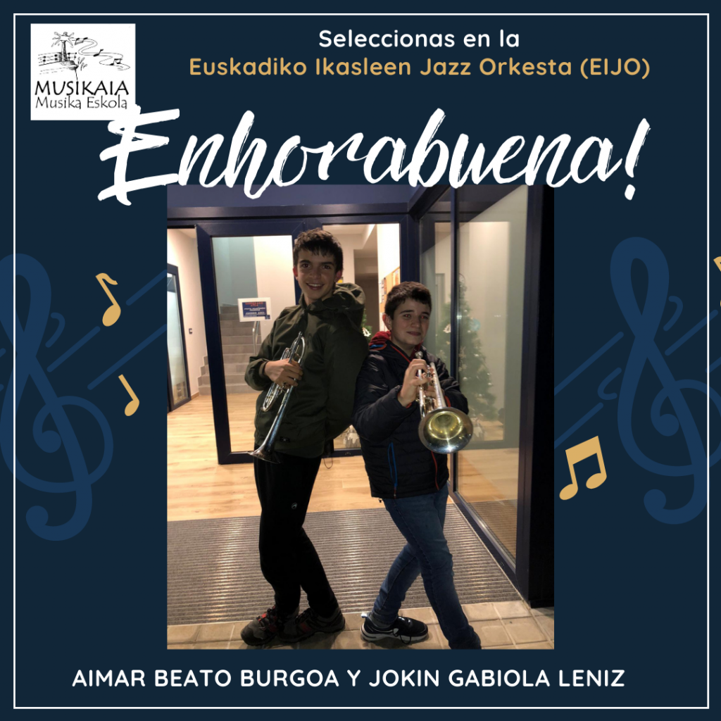 21-12-2020 Un año más, dos alumnos de trompeta de Musikaia Musika Eskola se han presentado a las pruebas de EIJO (Euskal Ikasleen Jazz Orkesta). Con la ayuda del profesor, se han preparado para las pruebas, y tras presentarse a ellas , han sido seleccionas para ser parte dela orquesta. ¡Enhorabuena Jokin Gabiola Leniz y Aimar […]