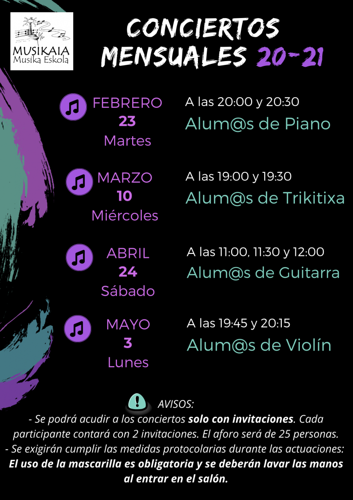 09-02-2021 Todos los años celebramos los CONCIERTOS MENSUALES en el Aula Magna de la Escuela de Música. Tras analizar la situación de este año, hemos decidido llevar a cabo esta serie de conciertos, pero sólo con miembros de aquellos instrumento que no utilicen la boca para tocarlos: Piano, Trikitixa, Guitarra y Violín. De este modo, todos los […]