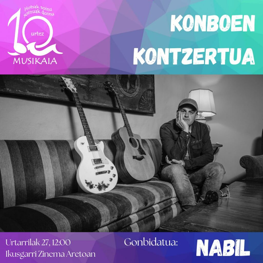 NABIL TALDEA presentará su nuevo disco en el concierto de COMBOS: 27 de ENERO, sábado Ikusgarri Zinema Aretoa 12:00 Participantes: Folk Txiki Taldea Folk Taldea Kamara Gazte Taldea Kamara Taldea Jazzkonboa Rock Txiki Taldea Rock Taldea Con la colaboración de NABIL ( Unai Egia ) taldea. Entrada libre (hasta completar aforo) «Hotsak soinu, soinuak doinu. 10 urtez, […]
