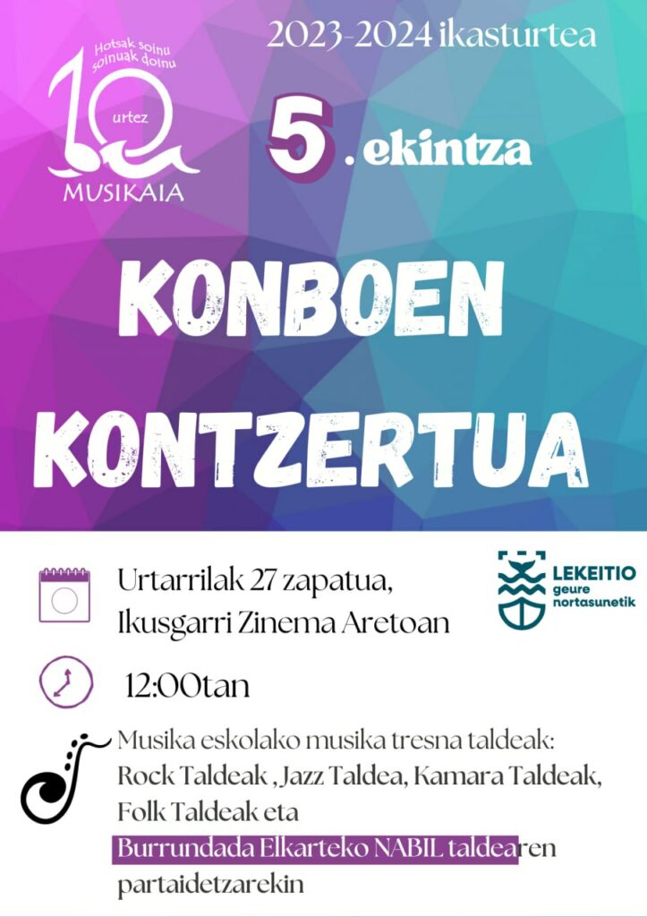 Concierto de COMBOS: 27 de ENERO, sábado Ikusgarri Zinema Aretoa 12:00 Participantes: Folk Txiki Taldea Folk Taldea Kamara Gazte Taldea Kamara Taldea Jazzkonboa Rock Txiki Taldea Rock Taldea Con la colaboración de NABIL ( Unai Egia ) taldea. Entrada libre (hasta completar aforo) «Hotsak soinu, soinuak doinu. 10 urtez, Musikaia»