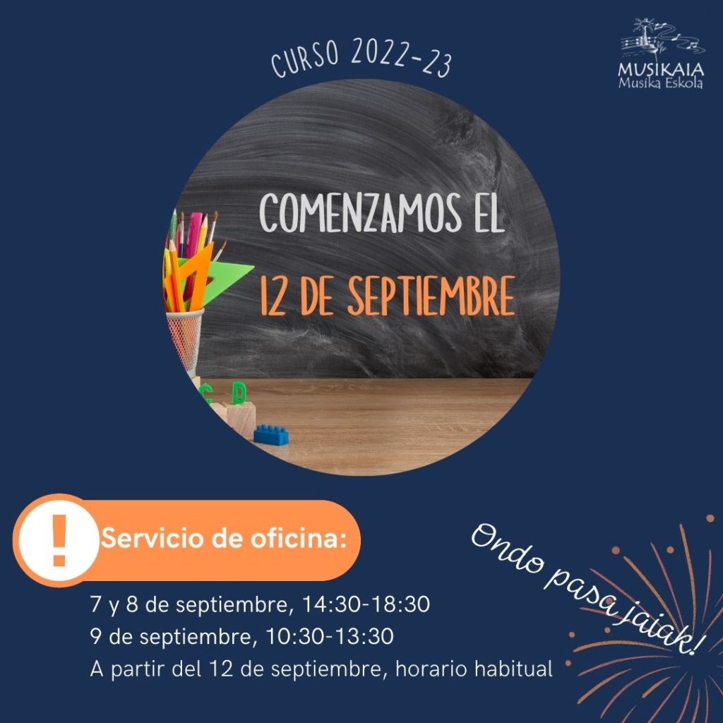 01-09-2022 Ya está a la vuelta de la esquina el curso 2022-23. La semana que viene ofreceremos servicio de atención y el día 8 se celebrará la reunión para montar los horarios con los alumnos de instrumento. El 12 comenzará el curso con total normalidad. Os deseamos unas felices fiestas
