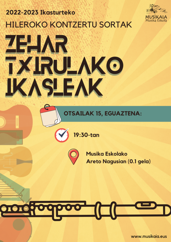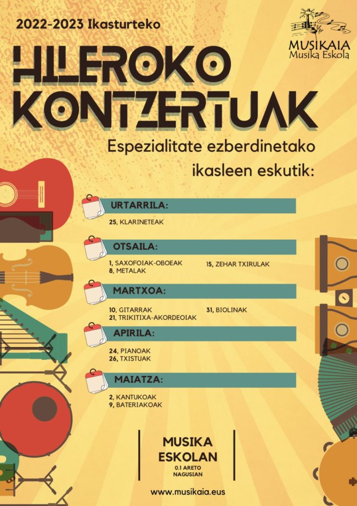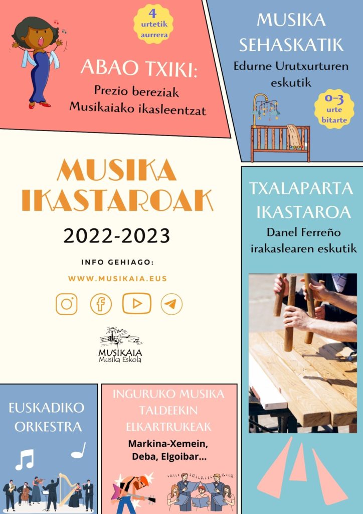 ¡Urte berri on 2023! Comenzamos con la segunda evaluación y con ella pondremos en marcha nuevos proyectos… ¡Vuelven los CONCIERTOS MENSUALES! Desde enero y hasta mayo, ofreceremos un par de conciertos mensuales en el auditorio 0.1 de la Escuela de Música Musikaia. En estos conciertos participarán alumn@s de cada instrumento y podréis acercaros a escucharl@s y […]