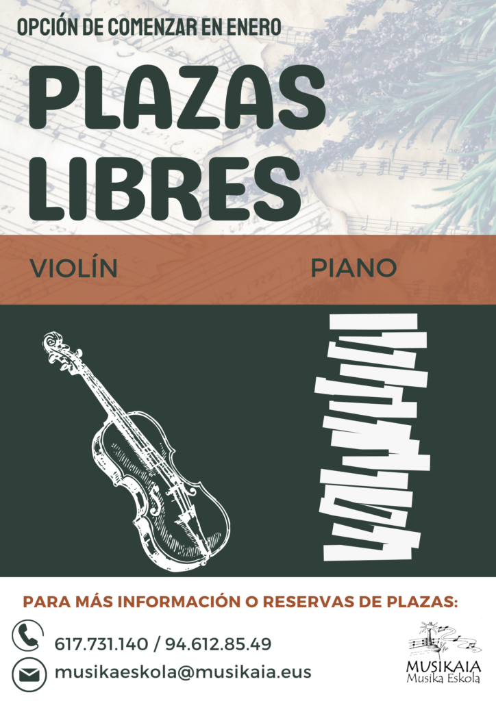 19-12-2022 Nos han quedado dos plazas libres en las siguientes asignaturas: VIOLÍN y PIANO. Clases individuales y personalizadas, con una duración de medio hora semanal. Estas clases comenzarán en enero. ¡No te quedes con las ganas! ¡Anímate!