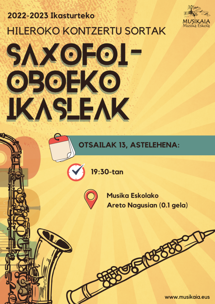 Concierto de SAXO/OBOE: ♦️Hoy, 15 de FEBRERO, lunes a las 19.30 en el 0.1 Areto Principal de la Escuela de Música. Acércate y disfruta de la función! 🤗📸🎵🎶🎷