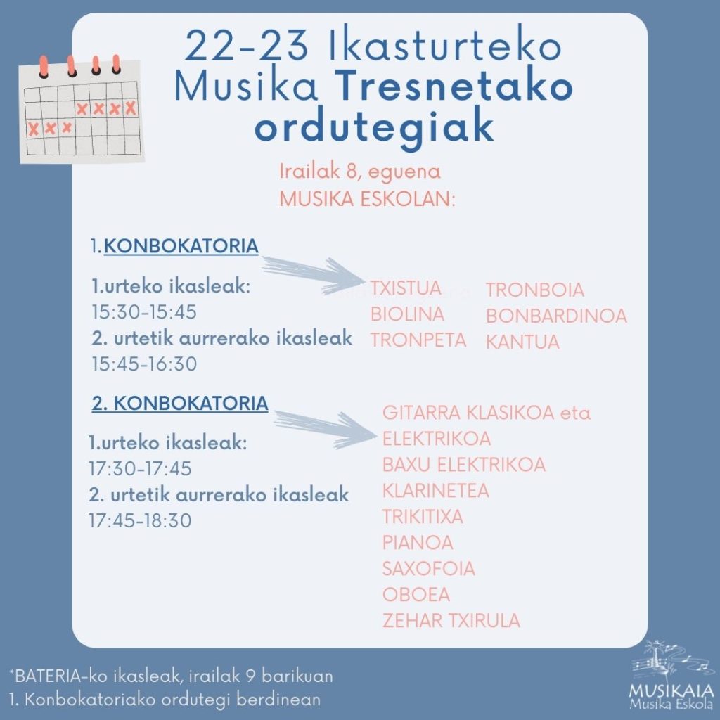 Gaur musika tresnetako ordutegiak antolatzeko batzarrak izango dira Musika Eskolan. 2 konbokatoria prestatu ditugu. Adi ordutegi ezberdinetara.